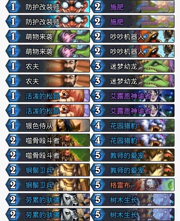 德魯伊對陣很多陣容都非常好打,按照正常的思路即可。德魯伊比較難打的是任務(wù)薩,任務(wù)薩一直都是天克德魯伊,盡管近日任務(wù)薩有所削弱,但是強度還是在的。打任務(wù)薩一定要用艾露+鋼鬢衛(wèi)兵打一波場面,后手用施肥拿到更多的牌。