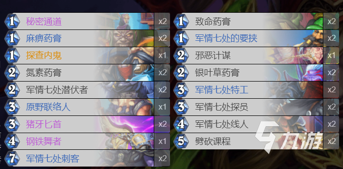 在任刀賊的起手留牌方面,主要是以秘密通道,邪惡計(jì)謀,銀葉草藥膏,軍情七處特工,軍情七處探員,軍情七處線人,劈砍課程,麻痹藥膏,探查內(nèi)鬼,氮素藥膏,軍情七處潛伏者,原野聯(lián)絡(luò)人,豬牙匕首,鋼鐵舞者等低費(fèi)卡牌為主。