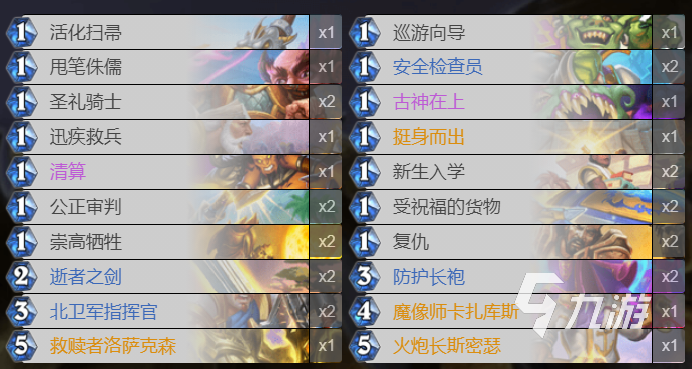在暴風城任務(wù)針扎騎的卡組構(gòu)成方面,主要是以騎士的各種優(yōu)質(zhì)一費隨從卡為主,例如:活化掃帚,甩筆侏儒,圣禮騎士,迅疾救兵,清算,公正審判,崇高犧牲,逝者之劍,北衛(wèi)軍指揮官,巡游向?qū)?,安全檢查員,古神在上,挺身而出,新生入學,受祝福的貨物,復仇。
