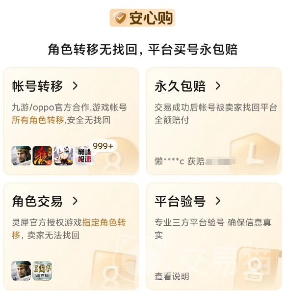 現(xiàn)在交易貓的模式全部都在強(qiáng)調(diào)安全性,從幾塊錢一個的賬號再到上萬塊的賬號,資源豐富不是交易貓的主打模式,而是團(tuán)隊推出的“安心購”政策給了買家莫大的保障,賬號一經(jīng)出手之后平臺將會全權(quán)負(fù)責(zé)售后問題,找回、被登錄、毀號等行為在安全購里都能得到保護(hù),并且安心購也只是出現(xiàn)在部分商品之上,能帶有安心購的商家往往個人信譽(yù)也是很不錯的。