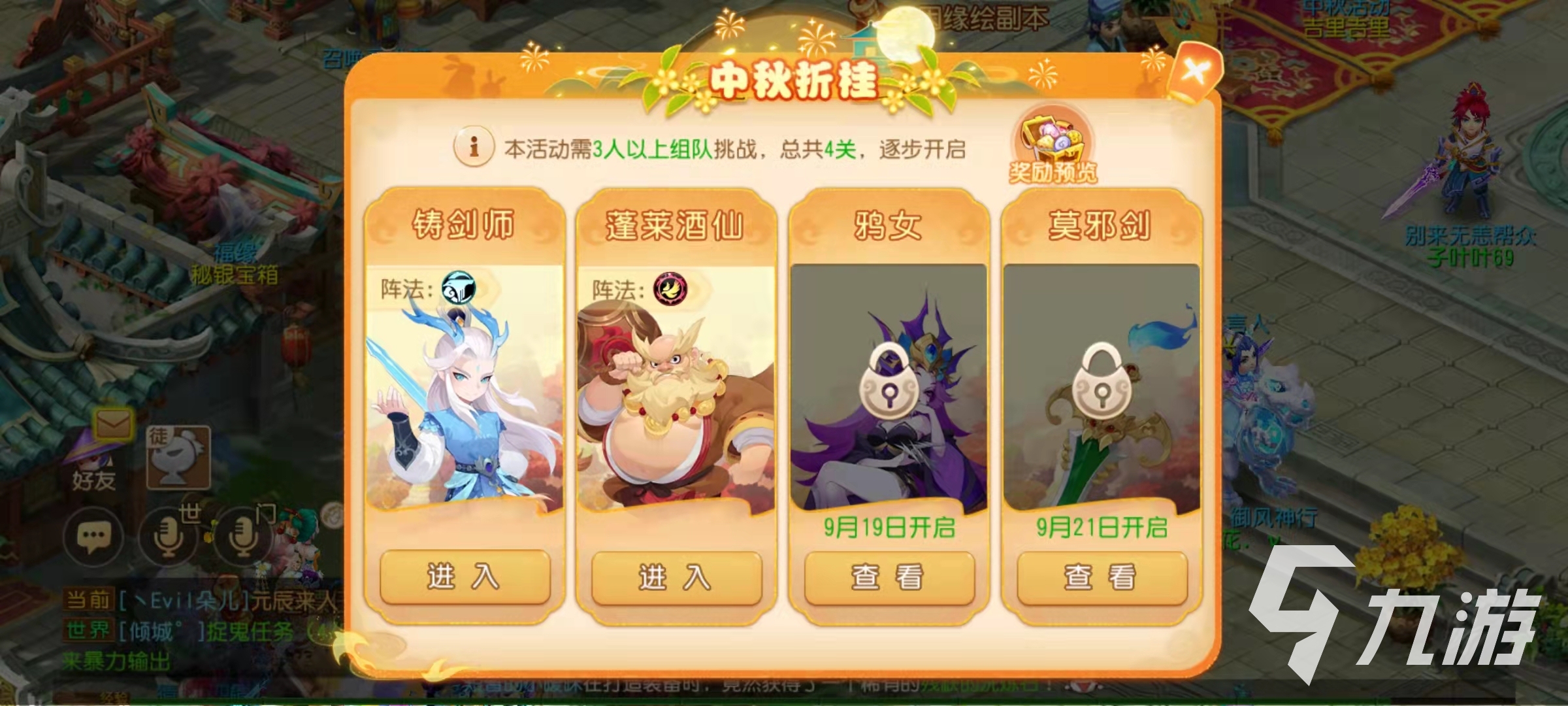 中秋折桂將于2021年9月15日開啟,在9月22日結(jié)束,本副本活動至少需要三名玩家組隊。關(guān)卡也分為四關(guān),將會在9月15日開啟鑄劍師關(guān)卡、9月17日開啟蓬萊酒仙關(guān)卡、9月19日開啟鴉女關(guān)卡、9月21日開啟莫邪劍關(guān)卡。