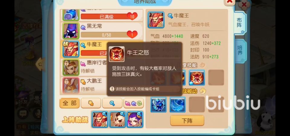 我們選擇牛魔王、紅孩兒和哪吒,技能卡組選擇月刃、獅搏和當頭一棒,增益卡選擇高級必殺、日暮簫聲和長空,然后就可以開始打了。