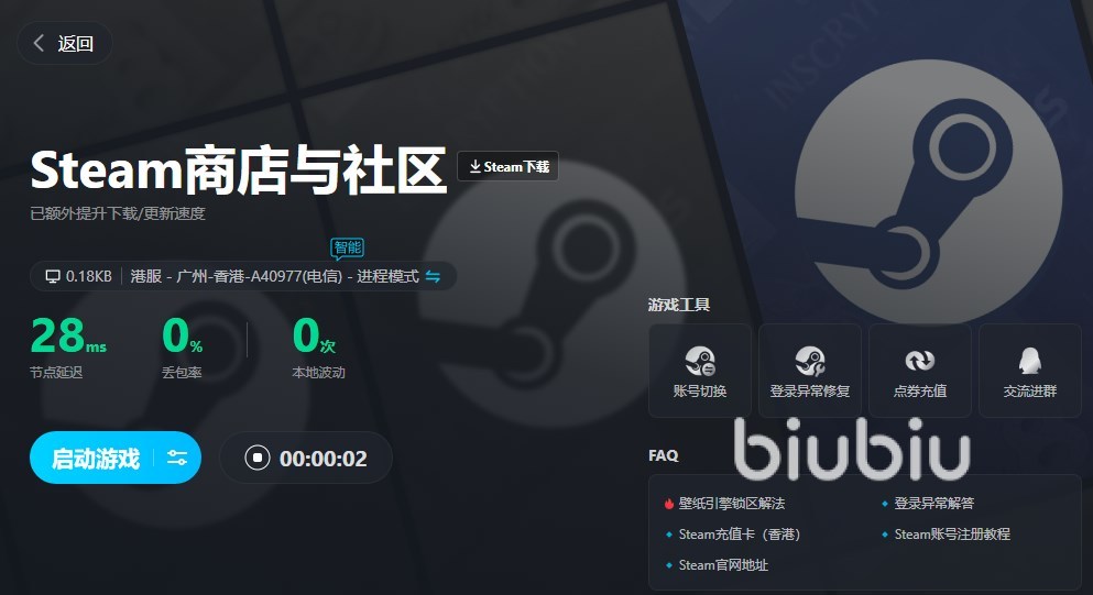 大家在使用steam的時(shí)候經(jīng)常會(huì)遇到要更新的情況,比如說某某游戲推出了新的大型DLC,或者修復(fù)了某某BUG。往往這個(gè)時(shí)候在啟動(dòng)游戲之前會(huì)有一個(gè)更新的過程,如果網(wǎng)速不好就要等待很久,甚至有時(shí)候會(huì)一直卡在那里不動(dòng)彈。有的玩家為此會(huì)去找單獨(dú)的資源包覆蓋安裝,如果這時(shí)候使用加速器,問題就會(huì)迎刃而解。也正是如此,所以這里才向大家推薦biubiu加速器。