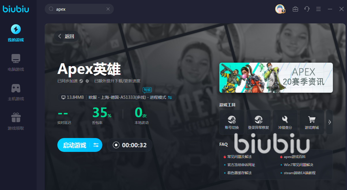 那么現(xiàn)在大家都知道apex英雄直接卡屏動不了怎么解決了吧,打開biubiu以后啟動一鍵加速,玩游戲的時候就不會卡卡的一直動不了了。有了biubiu大家就可以在apex英雄里暢通無阻,選擇自己喜歡的模式痛快玩起來吧。
