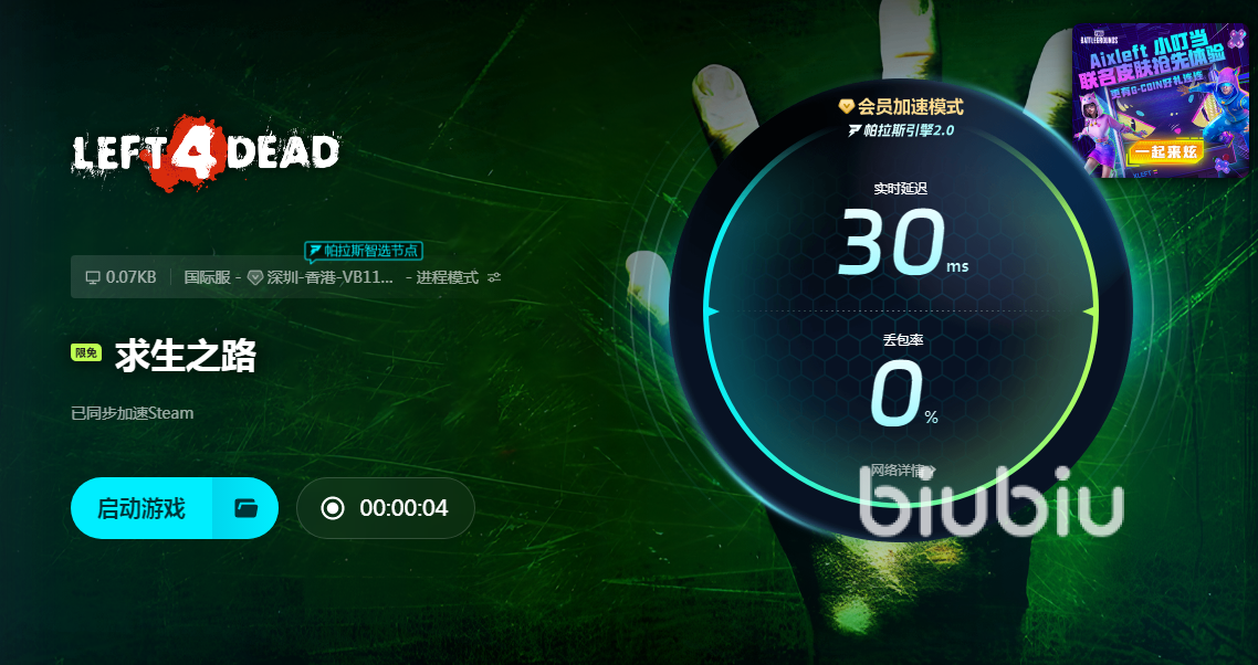 好了,以上便是求生之路閃退是什么原因的全部說明,玩家在體驗時,若是發(fā)現(xiàn)其經(jīng)時常出現(xiàn)丟包,或是延遲很高等現(xiàn)象時,去打開biubiu來開啟數(shù)據(jù)傳輸優(yōu)化還是很關(guān)鍵的,其專線級的加速能力,可快速確保用戶優(yōu)先體驗的穩(wěn)定。