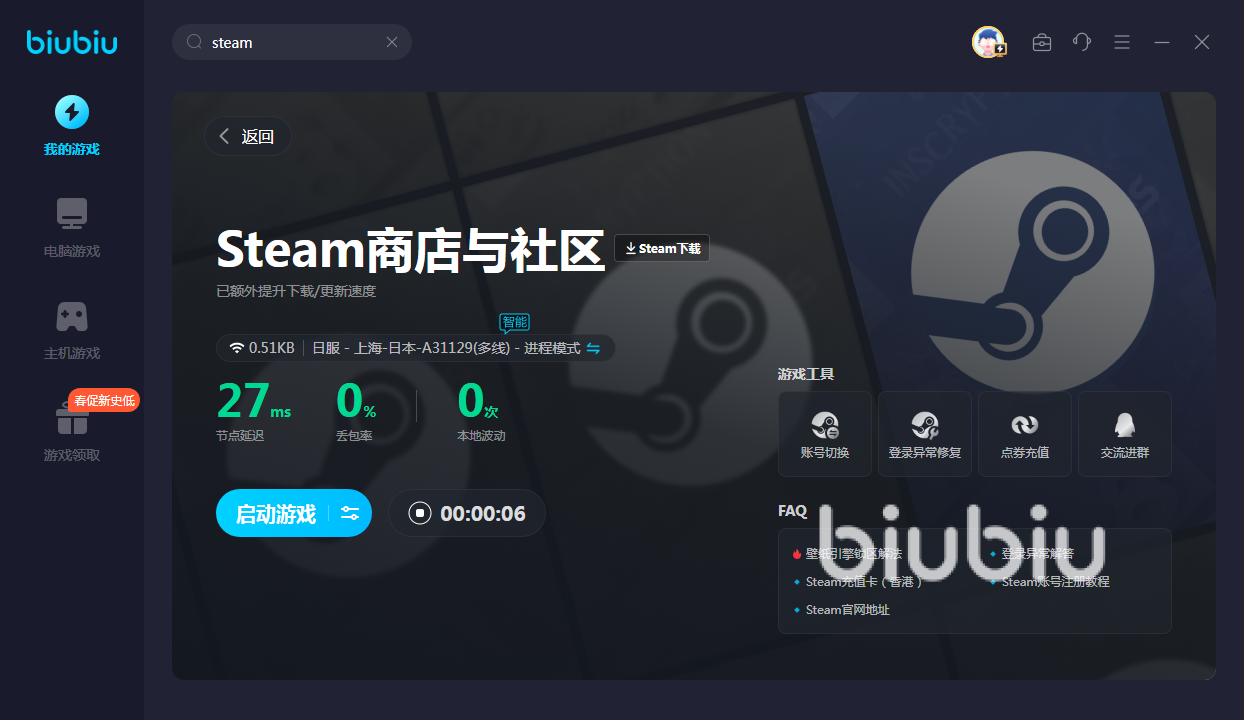 操作的方法也很簡單,只需要完成biubiu下載安裝之后,直接輸入steam,就可以找到相關選項。對該平臺進行加速后,無論是游戲客戶端進行下載還是更新,或者是使用平臺其他功能,都會流暢很多。這時通過steam平臺打開游戲,也同樣具有了優(yōu)化效果,能夠避免出現(xiàn)閃退、延遲高這樣的問題,開啟高畫質后也不用擔心掉幀,在建造過程中能夠放開手腳去體驗?,F(xiàn)在還能使用這款軟件先免費加速,新注冊的賬號直接打開軟件,就可獲得24小時加速時間。所有新老用戶,每個賬號都有一次機會,打開兌換功能后在其中輸入【biubiu不卡頓】,獲得三天免費加速時間。這樣就可以打消新用戶對于軟件加速性能的疑慮。
