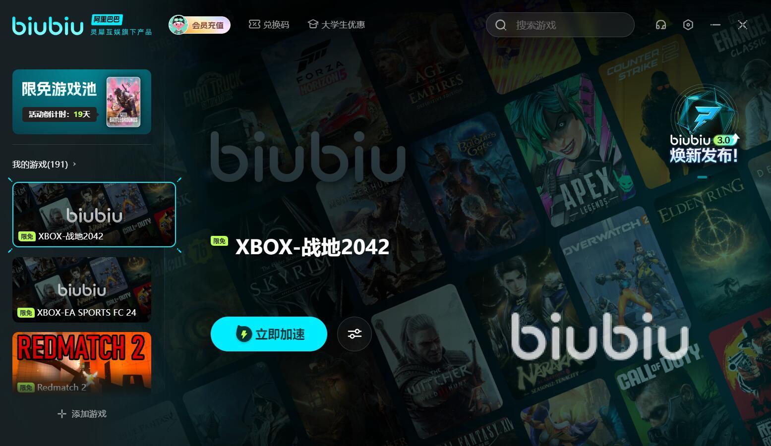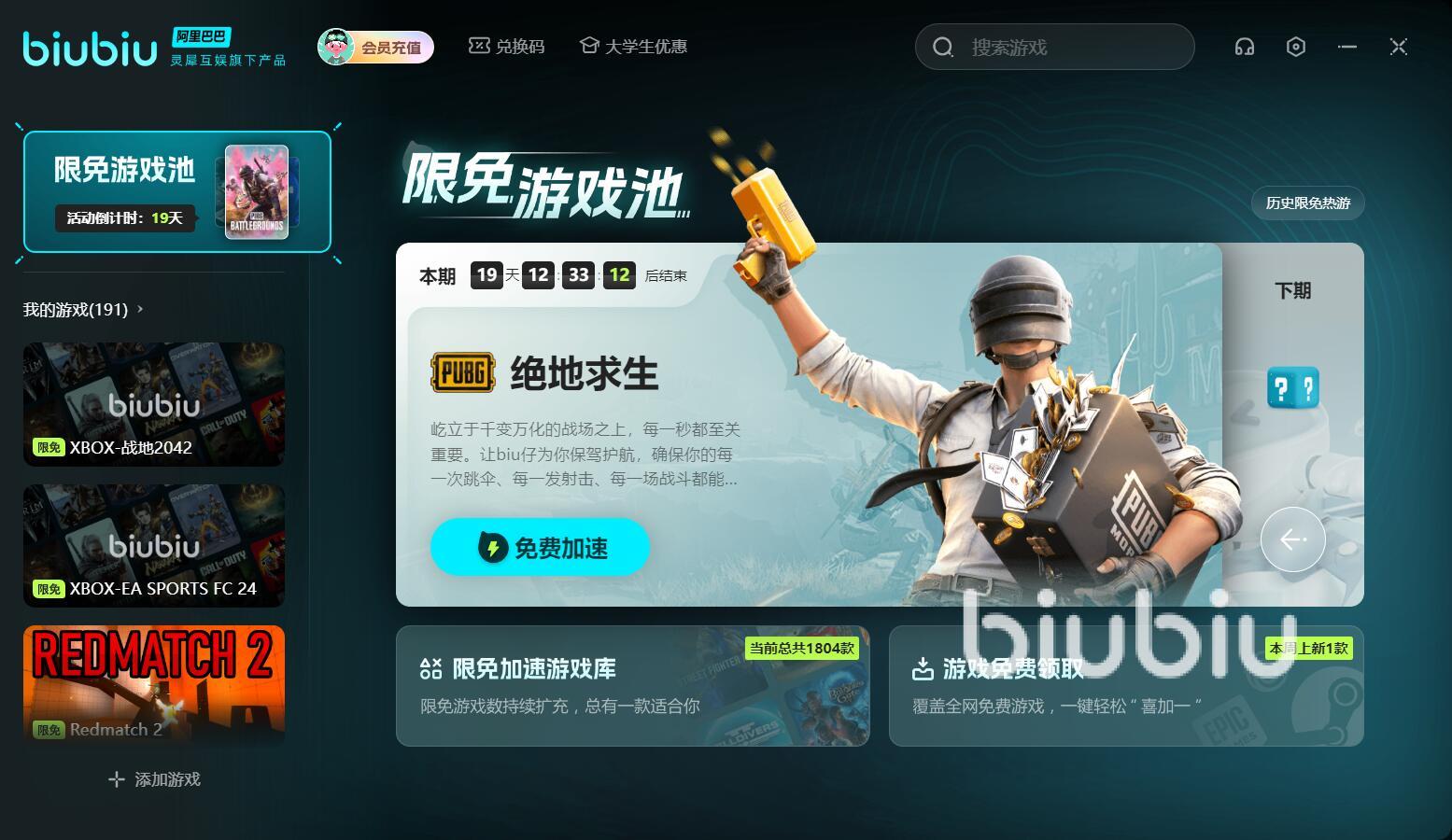 為了回饋廣大用戶,平臺最近上線了多個福利活動,每個用戶在輸入專屬兌換碼【biubiu不卡頓】就能領(lǐng)到3天的加速時長,如果你是新用戶的話,那么注冊就能領(lǐng)到24小時的加速時長。軟件內(nèi)還加入了一個游戲限免池,其中會顯示哪些游戲可以享受免費的會員服務(wù),大家在體驗游戲前,可以先到這個區(qū)域看看。