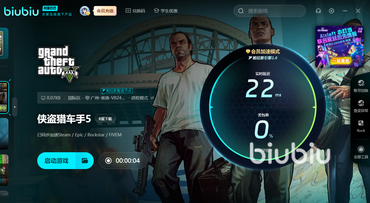 Gta5目前并木有上線國(guó)服,所以想進(jìn)入其他地域的罪惡都市。大家還得借助biubiu,通過加速后,才有資格進(jìn)入這方世界進(jìn)行大角逐!新用戶的話,可領(lǐng)取24H的免費(fèi)加速;另外新老用戶亦可輸入【biubiu不卡頓】,額外體驗(yàn)三天免費(fèi)加速,盡情嗨玩享不停!要是與敵人交火時(shí)卡頓的話,很有可能被人一槍帶走。還好有了加速器,這一切顧慮都不會(huì)實(shí)現(xiàn),讓你輕松解決戰(zhàn)斗!