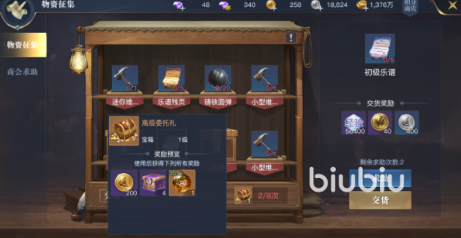 游戲內(nèi)等級(jí)達(dá)到46級(jí)后可解鎖【物資征集】玩法,玩家可在活動(dòng)界面內(nèi)點(diǎn)擊進(jìn)入界面,遞交界面內(nèi)的貨物后即可獲得其貨物指定的經(jīng)驗(yàn)值、商會(huì)貢獻(xiàn)度、銀幣交貨獎(jiǎng)勵(lì)。在交貨達(dá)到一定數(shù)量后,還可獲得初級(jí)、高級(jí)委托禮寶箱,額外獲得商會(huì)貢獻(xiàn)度、金幣、鐵塊、卓越魂石、希望之花碎片這類獎(jiǎng)勵(lì),完成后可獲得2點(diǎn)活躍度的獎(jiǎng)勵(lì)。