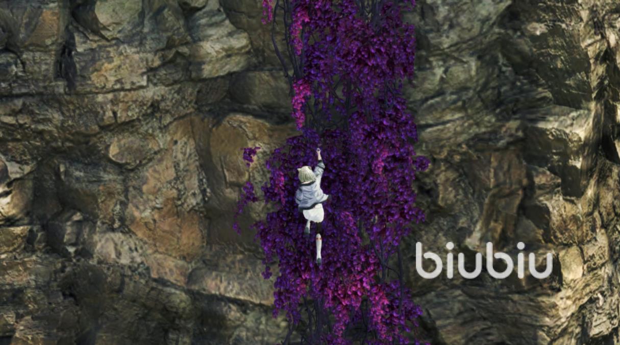 至于這些不同的場景技能如何派上用場?其實也不難,第一個攀墻技能主要用于紫藤這個特殊地形上,在場景中遇到了有紫藤的山壁,就能通過這個技能來爬上去了;