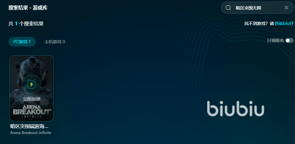 以暗區(qū)突圍無限這款熱門的生存射擊游戲?yàn)槔@險(xiǎn)刺激的槍戰(zhàn)非常需要一個(gè)穩(wěn)定的網(wǎng)絡(luò)來確保游戲過程中不會(huì)突然出現(xiàn)卡頓,同時(shí)也需要將ping值始終維持在一個(gè)可以接受的區(qū)間,這樣才能在與敵人對(duì)峙的時(shí)候不落下風(fēng),發(fā)揮出自己應(yīng)有的水準(zhǔn)。Biubiu加速器顯然也是支持這類熱門游戲的,大家直接在搜索中輸入游戲名或者相應(yīng)關(guān)鍵字就可以檢索到該游戲。