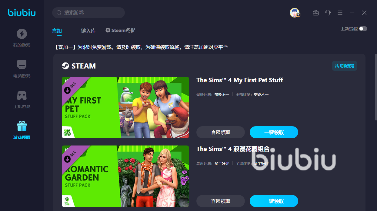 這里推薦biubiu給大家,登錄瀏覽器進(jìn)行搜索,點(diǎn)擊進(jìn)入官網(wǎng),找到下載選項(xiàng)就能看到了。整個(gè)下載過(guò)程都很快,登錄之后就可使用了。并且biubiu專(zhuān)門(mén)開(kāi)設(shè)了“喜加一”、“一鍵入庫(kù)”、“冬促”專(zhuān)區(qū),一鍵就能查看到所有優(yōu)惠信息,太方便了。