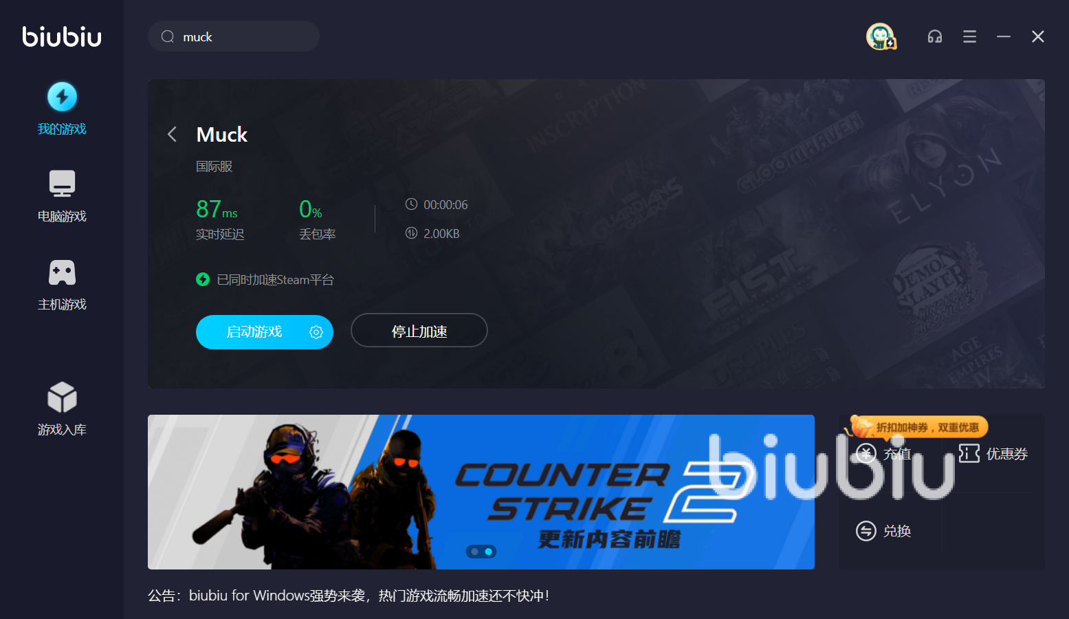 下載安裝好biubiu加速器后只需要在右上角搜索《muck》即可把游戲添加到【我的游戲】中進行加速,而下次再打開加速器的話也能在畫面中一眼看到上次加速的游戲是哪個,并進行快速的點擊加速體驗。