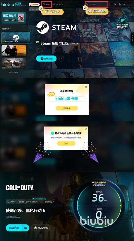 推薦該加速器的原因之一,當(dāng)然就是針對(duì)有些可能一開(kāi)始對(duì)加速器不放心,但是又不想一開(kāi)始就付費(fèi)的玩家了,該加速器首先作為新人用戶,是擁有24小時(shí)免費(fèi)體驗(yàn)時(shí)間的,而且輸入對(duì)應(yīng)“biubiu不卡頓”的兌換碼,還能額外再兌換3天免費(fèi)時(shí)長(zhǎng),免費(fèi)體驗(yàn)時(shí)間就相當(dāng)?shù)挠押昧?。而且目前還有一個(gè)針對(duì)該游戲的專門的福利,就是在8月28日到9月9日期間對(duì)該作是限時(shí)免費(fèi)加速的,也就是說(shuō)使命召喚黑色行動(dòng)6在測(cè)試期間直接可以享受免費(fèi)加速效果了。