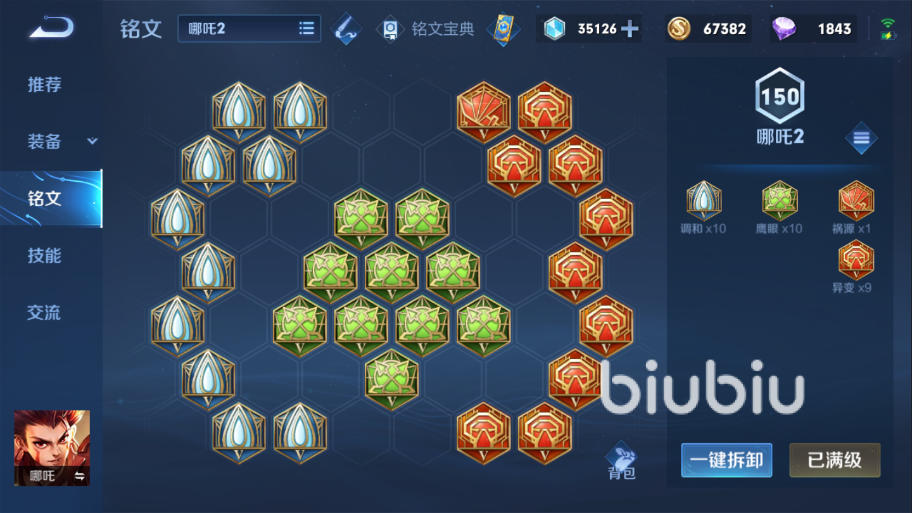 1、銘文推薦:哪吒的銘文小編選用的是半肉半輸出,10個調(diào)和、10個鷹眼、10個宿命。