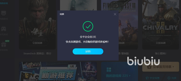 這款加速器為廣大玩家準備了一個福利,使用“biubiu不卡頓”就能夠在軟件兌換界面中獲取到三天免費會員時長,走過路過千萬不要錯過哦!如果你還沒有下載命運2這款游戲,也可以先在軟件中開啟加速,這樣可以提高steam等平臺的游戲下載安裝速度,而且還可以在掛上游戲領取相關的服務后前往steam商店快速領取一些免費游玩的優(yōu)質作品,還是比較給力的,趕快嘗試一下吧。