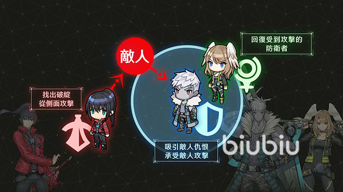 攻擊者自然主打輸出,他的站位非常關(guān)鍵,要發(fā)現(xiàn)目標(biāo)的破綻,同時(shí)能繞其身后或身側(cè)來(lái)打出高額的傷害;防衛(wèi)者主打的就是防守以及閃避,拉仇恨為己方隊(duì)友抗傷;而治療者主打的就是回復(fù)hp,同時(shí)對(duì)重傷隊(duì)友進(jìn)行治療。