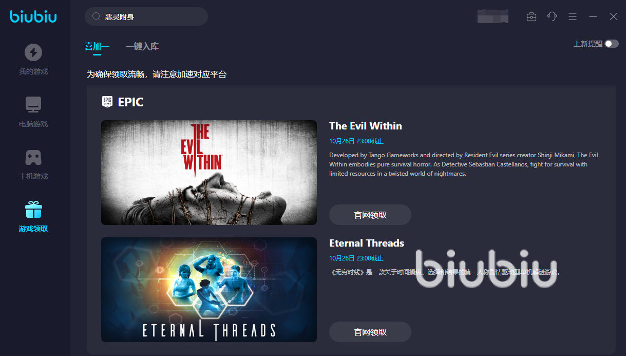 以上就是小編為大家?guī)淼年P(guān)于,Epic萬圣節(jié)惡靈附身如何領(lǐng)取的教程。步驟非常的簡單便攜,大家只需要根據(jù)提示一步步操作即可。如果直接在Epic官網(wǎng)領(lǐng)取不成功的話,那么biubiu這個(gè)喜加一的功能也是十分的方便。不僅對(duì)于Epic贈(zèng)送的免費(fèi)游戲可以一目了然,就能steam平臺(tái)的喜加一游戲也同樣可以輕松知道。如果你是喜歡白嫖各種游戲,卻總是錯(cuò)過領(lǐng)取時(shí)間的玩家,那么就趕快去biubiu試試吧。