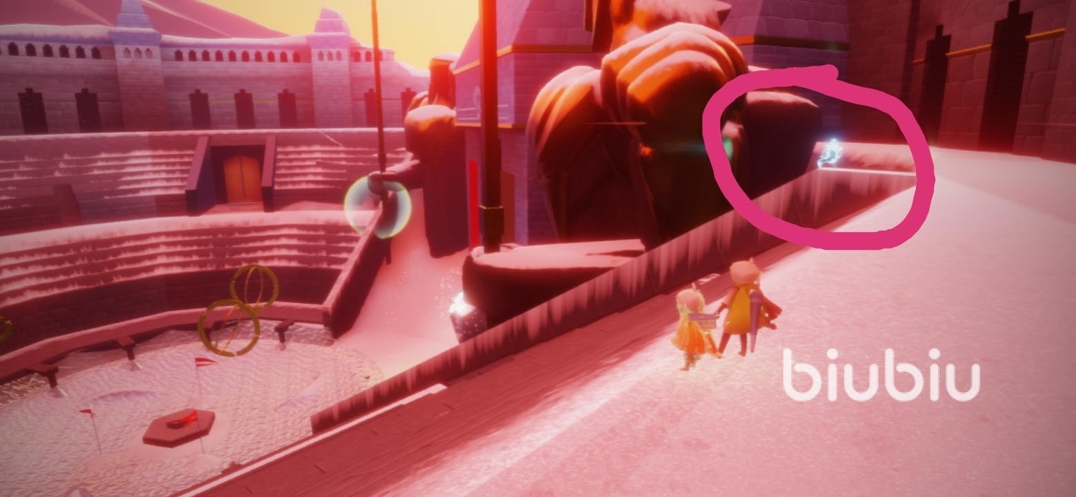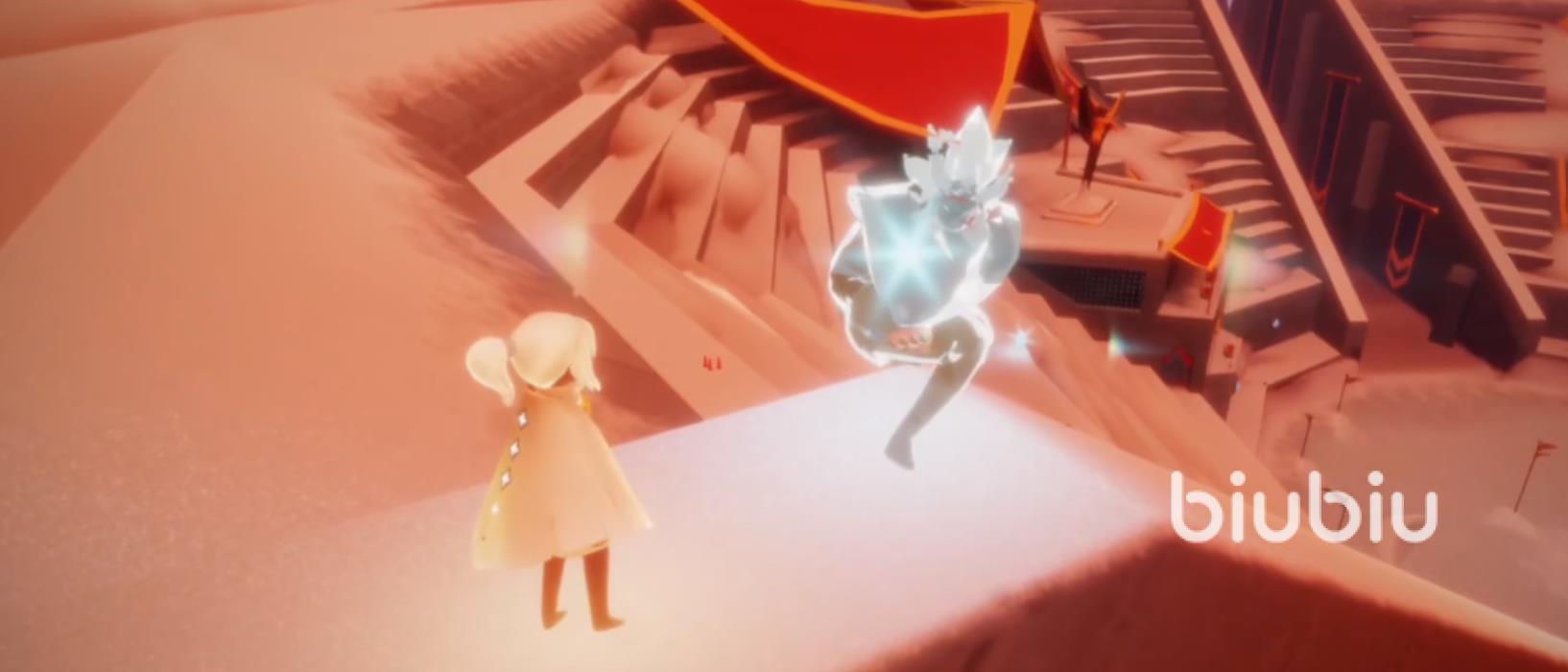 對(duì)于尚未找到人的小伙伴們,接下來(lái)分享兩個(gè)找人的路線,其中第一個(gè)就是,各位先飛去滑冰場(chǎng),借由左側(cè)的飛行賽道,飛去神廟,在后面的路上會(huì)遇到兩個(gè)藍(lán)光,將它們一一收集,再來(lái)到競(jìng)技場(chǎng),上右側(cè)的臺(tái)子上,就能看到先祖的身影了;