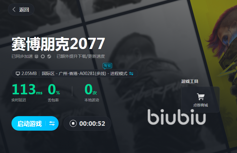 環(huán)境改善以后,大家隨時都可以點擊按鈕來加速游戲了,它的加速是隨時可以開啟并且停止的,頁面上直接顯示加速后的網(wǎng)速情況,還能看到已經(jīng)加速的時長以及其他輔助小工具。軟件帶來電競級的網(wǎng)速,大家在這樣的條件下進入賽博朋克2077玩起來就特別爽了,一秒就能領取到任務,移動速度也很快,遇到敵人就能反應迅速地進行反抗或者攻擊,再也不用受到延遲的干擾了。