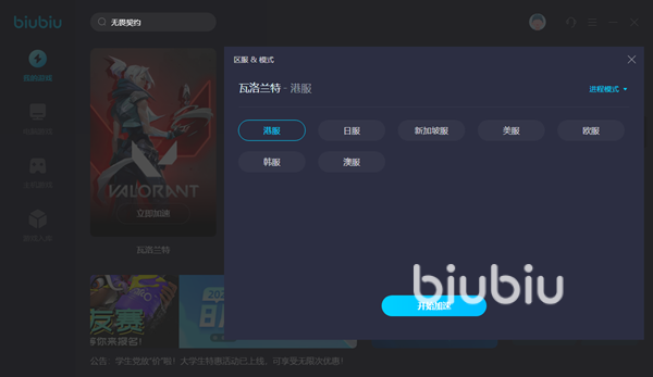在biubiu加速器內(nèi)就提供了對(duì)這款游戲的支持,而且不管是剛剛加入進(jìn)來(lái)的國(guó)服玩家還是國(guó)際服瓦羅蘭特的老玩家都可以使用。我們直接在軟件中搜索無(wú)畏契約就可以看到這兩個(gè)游戲版本了。這里大家會(huì)注意到,國(guó)服無(wú)畏契約是可以直接免費(fèi)加速的,而想要加速?lài)?guó)際服的新用戶(hù)可以領(lǐng)取24小時(shí)免費(fèi)試用的特權(quán),是不是非常良心。