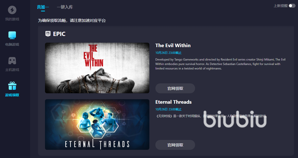 具體的領(lǐng)取方法,大家可以前往biubiu加速器的客戶(hù)端,點(diǎn)擊左邊的欄目的最下方【游戲領(lǐng)取】,進(jìn)入之后,就可以直接看到Epic的喜加一,屆時(shí)官方領(lǐng)取就能跳轉(zhuǎn)獲得限時(shí)免費(fèi)游戲。