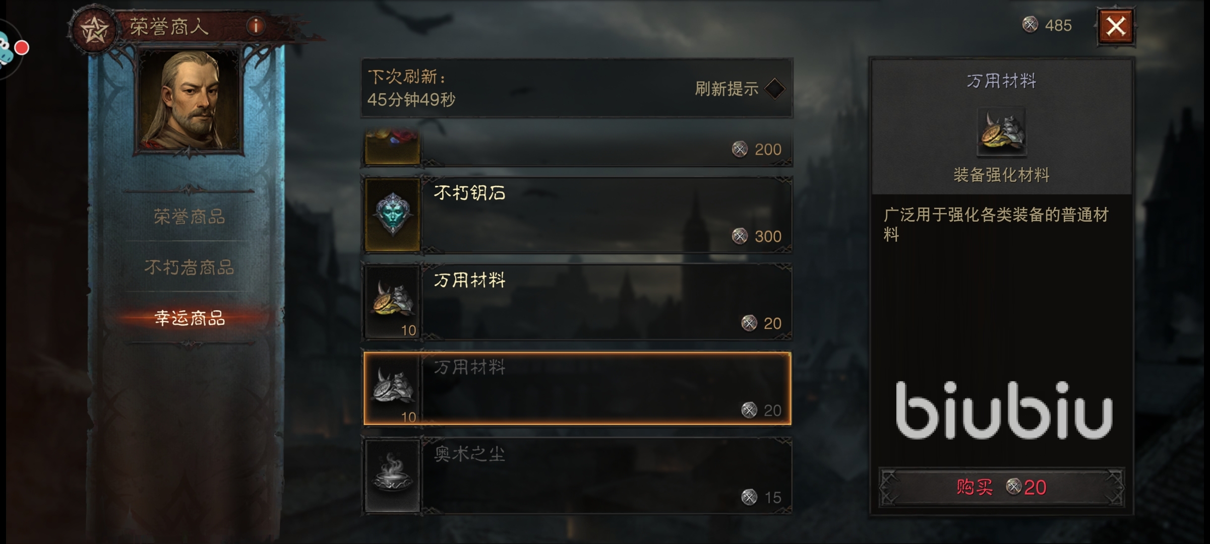 榮譽(yù)是一種物品,通過游戲內(nèi)各種玩法獲得,可以兌換各種稀有物品,如下圖,另外還有幸運(yùn)商店,每天刷新2次,每次都可能刷新出普通寶石、不朽鑰石、洗煉石、簡易護(hù)身符,限購1個(gè)。