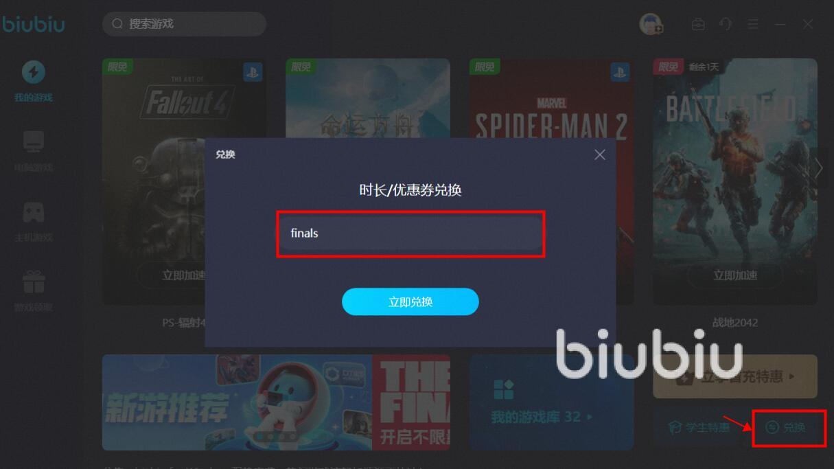 而且現(xiàn)在除了新人可以免費(fèi)使用biubiu24小時(shí)的會(huì)員加速效果,無論是新用戶還老用戶,使用finals這個(gè)兌換碼在PC端輸入就可以直接得到24小時(shí)的會(huì)員時(shí)間,這么好的活動(dòng)可千萬不容錯(cuò)過哦。