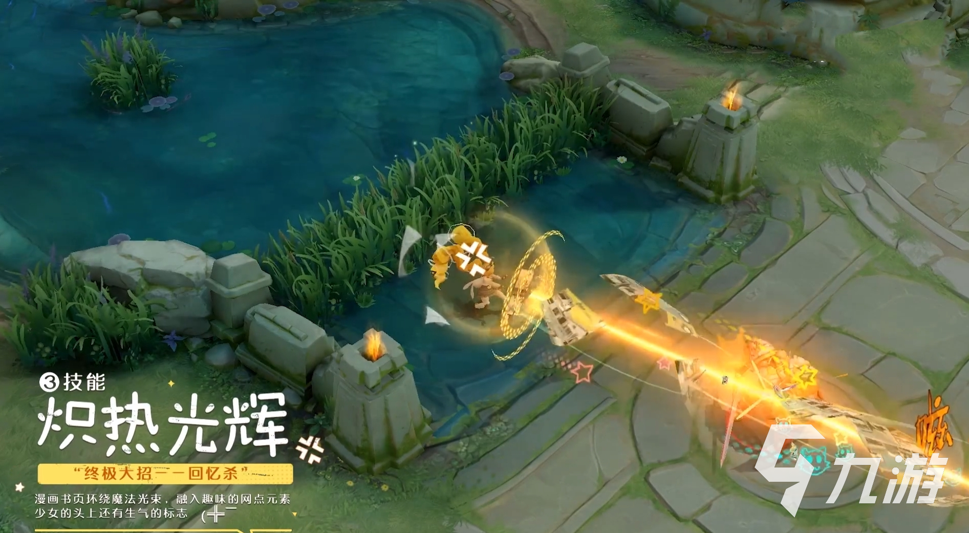 在外形設(shè)計上,安琪拉的造型是目前峽谷里很少見的制服系列,此次的安琪拉化身格子裙校服元氣少女漫畫家,不得不說真的有戳中很多玩家的心理。兩個大大的金色雙馬尾,帶著兔子耳機,身穿格子裙校服,一定會成為王者峽谷里一道靚麗的風景線。在特效方面,技能光效以金黃色為主,二技能和大招會很明顯,圍繞著有音符、星星、書本等符號,還是很亮眼的。
