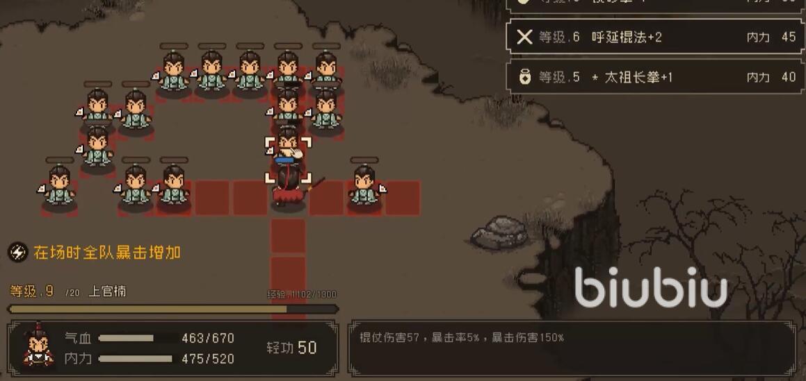 大家如果還想讓上官楠的戰(zhàn)斗能力得到完全展現(xiàn),最好在戰(zhàn)斗的過程當(dāng)中,直接使用該角色沖入敵人的隊(duì)伍,然后釋放一次呼延棍法,基本上可以對所有范圍內(nèi)的敵人造成傷害。整個過程還會讓上官楠獲得大量的角色經(jīng)驗(yàn)值,升級的效率也會得到增加。當(dāng)然,在敵人反擊的過程當(dāng)中,使用小黃狗來進(jìn)行生命值恢復(fù)即可。