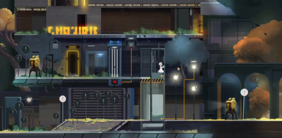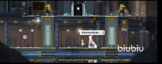 游戲玩到這里,其實(shí)老玩家們可以發(fā)現(xiàn),在難度以及解謎的復(fù)雜程度是有了一個(gè)顯著提升的?;氐秸九_(tái),同樣是在數(shù)據(jù)中心的位置選擇和機(jī)器人進(jìn)行對(duì)話,這里你會(huì)發(fā)現(xiàn)他提示你一定要注意機(jī)器人的巡邏路線。點(diǎn)亮面前三盞燈以后,你會(huì)發(fā)現(xiàn)樓上樓下都有巡邏隊(duì)。這時(shí)候你先站到升降電梯那里,等到兩個(gè)機(jī)器人走到最左邊,乘機(jī)下樓向前。