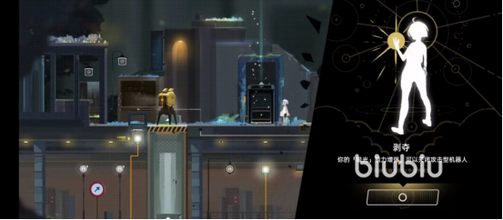 來到前面你會(huì)發(fā)現(xiàn)面前剛好堵著一個(gè)機(jī)器人,還是點(diǎn)亮頭上三盞燈,打開電梯,再上二樓。左邊的黃色小門點(diǎn)亮,順利進(jìn)入。npc發(fā)光小鹿繼續(xù)出現(xiàn),提示你樓上上鎖機(jī)器的作用,順便解釋了巡邏機(jī)器人的來由。還是先打開升降梯,上二樓,打開上鎖機(jī)器。獲得剝奪能力。剝奪能力就是主角的吸光能力增強(qiáng),然后可以強(qiáng)行停了巡邏機(jī)器人,直接讓他們關(guān)機(jī)。這個(gè)技能還挺流氓的。到這里沒什么難度,不過每個(gè)機(jī)器人身上也會(huì)有一個(gè)光源,記得收集。