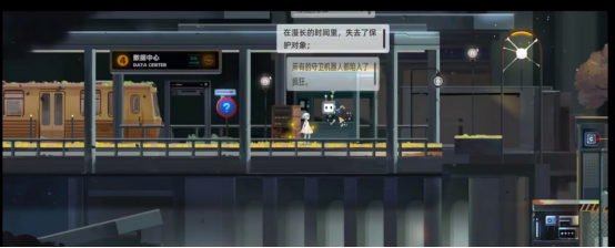 我們先離開,進(jìn)入下一個(gè)場(chǎng)景。跟上一關(guān)一樣停了機(jī)器人,收集他們身上的光源,打開旁邊的綠色安全門,進(jìn)入到數(shù)據(jù)中心的內(nèi)核。你的小電腦人會(huì)告訴你,要重建車站必須要恢復(fù)站臺(tái)的供能,首先就要打開三個(gè)動(dòng)力源。