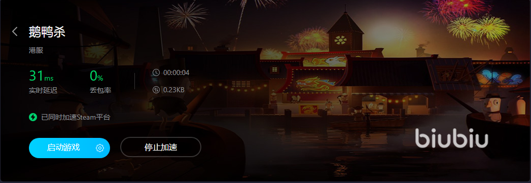 添加好游戲之后,就是給游戲進(jìn)行加速了,以鵝鴨殺為例,小伙伴們只需要在biubiu中啟動(dòng)鵝鴨殺游戲,就能一鍵啟動(dòng)游戲并加速,不需要小伙伴們同時(shí)打開(kāi)游戲和biubiu,只要用biubiu就可以直接解決,十分方便,非常適合之前沒(méi)有用過(guò)加速器的小伙伴們使用。