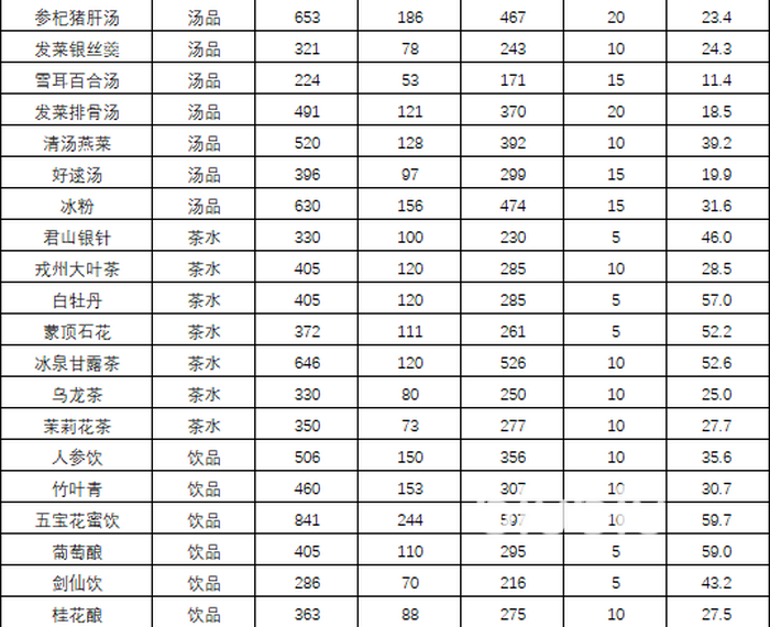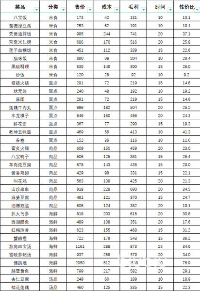 大家可以參照下面我給大家準(zhǔn)備的表格來參照性價比詳情,從表格中看飲料類的五寶花蜜飲帶來的性價比最高,其次就是葡萄釀和茶水類的白牡丹。性價比最低的就是炒飯了。大家可以參照這個表格來選擇自己要多準(zhǔn)備的菜譜從而獲得收益的最高化。但是也不能性價比低的菜品就不上架了哈,游戲里的所有都很重要的。