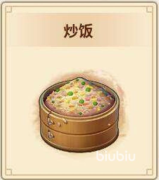 下面我們來介紹一下菜譜配方吧。主食內(nèi)有炒飯和八寶飯。炒飯我們需要大米x1+葉菜x1,然后需要10秒的制作時間。需要我們先把米蒸熟后再用熱油炒制,需要添加一些蔬菜、海鮮、肉蛋類或水果等作為輔料,可以根據(jù)輔料不同更改炒飯的名稱,炒飯是很常見的一種食品。