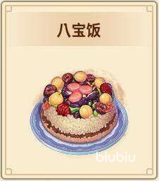 八寶飯需要觸發(fā)趙靈兒和丁香蘭比賽烹調(diào)的事件之后才能得到解鎖。需要的材料有大米x1+水果x2,我們的用糯米、豆沙餡做成地,上面一層需要有蓮子、蜜棗等八種蜜餞制成的圖案。然后只需要蒸熟后最后澆上蜜糖汁就可以直接食用了,只需要10秒的制作時間。