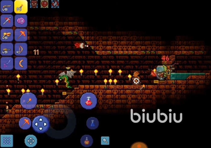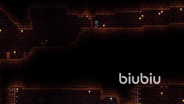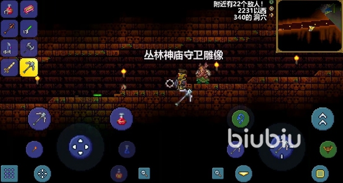 但是在困難模式之前我們是可以通過一些非常規(guī)方法進入到神廟中的,這需要我們準備兩個木平臺以及一個錘子。將兩個木平臺擺放在叢林神廟上鎖的叢林蜥蜴門之外,然后使用錘子將木平臺敲擊成階梯形狀之后我們就可以順利的進入叢林神廟之中了。神廟中有大量的陷阱,還是非常兇險的。