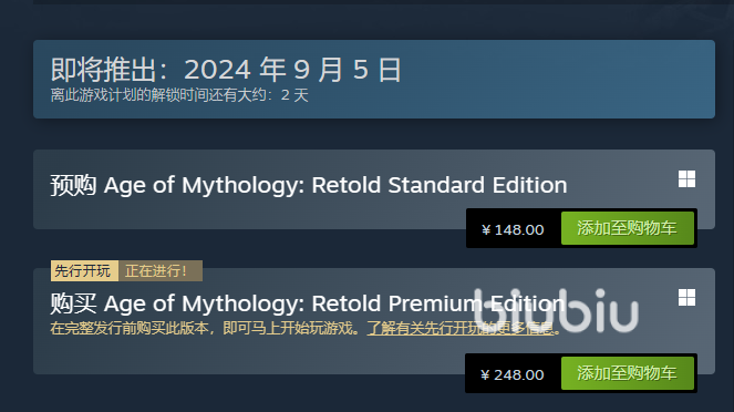 想要獲取可以直接在steam搜索Age of Mythology: Retold,就可以找到這款游戲了,而加速的時候我們需要注意先打開biubiu客戶端,點擊加速steam再去操作,就可以享受到下載提速和游戲提速的雙重效果了。游戲已經(jīng)開啟了搶先體驗活動,想要先人一步的快去獲取吧。