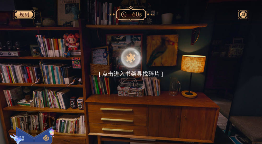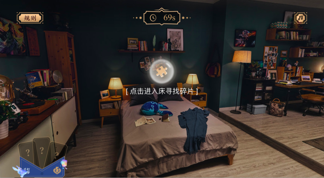 第一張神秘碎片在床上,走到床的前面會(huì)自動(dòng)出現(xiàn)上圖所示的拼圖按鈕,點(diǎn)開即可獲得第一張神秘碎片。