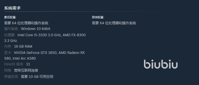 如果大家的電腦滿足了64位Win10的系統(tǒng),CPU達(dá)到了酷睿i5-3330或者FX-8300的水準(zhǔn),運(yùn)行內(nèi)存達(dá)到了16GB,顯卡是GTX 1650或者性能差不多的ARC A580,然后再擁有足夠的硬盤使用空間,那么我們就能夠以最低的特效去運(yùn)行此游戲了,由于目前只是試玩版本,所以推薦的配置暫未公布。