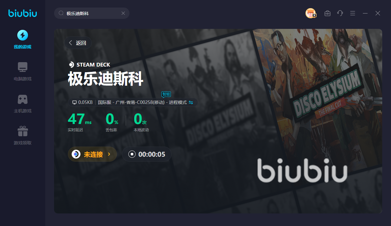 想要在biubiu里開啟游戲加速也是再簡單不過,就是先輸入【極樂迪斯科】游戲名字,然后對應(yīng)選擇自己想玩的登錄客戶端,你會發(fā)現(xiàn)從游戲登錄再到提供穩(wěn)定加速其實就一分鐘不到的時間,這也算是磨刀不誤砍柴工,更何況速度還很快。