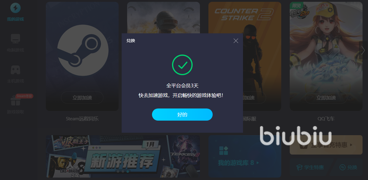 現(xiàn)在biubiu也有很多活動(dòng)在開(kāi)展,新用戶(hù)參與使用可以享受24小時(shí)的免費(fèi)加速效果,另外輸入專(zhuān)屬兌換碼【biubiu不卡頓】還可以多享受72小時(shí)加速時(shí)間哦,這么長(zhǎng)的免費(fèi)加速時(shí)間一定不要錯(cuò)過(guò)了。