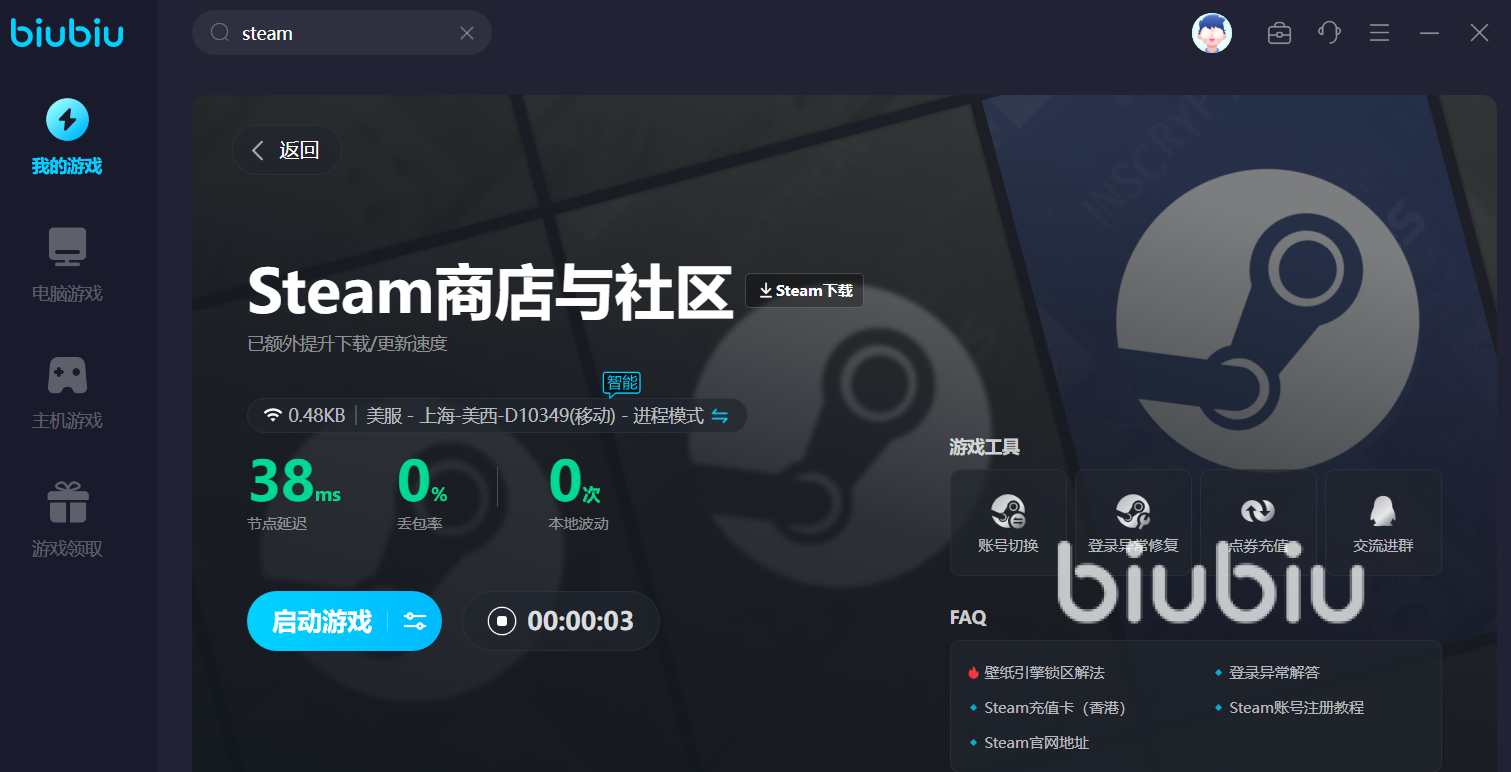 作為熱銷全球的大型在線游戲銷售平臺,steam游戲庫內會匯聚數(shù)以萬計的優(yōu)秀游戲,同時還經常推出節(jié)假日的促銷游戲打折活動,還有一些老游戲,會不定期贈送免費領取的機會。但是這些游戲都需要提前鏈接steam的平臺商店與社區(qū),因為其服務器位于海外,導致很多國內的玩家經常連不上而措施打折良機。如果你在使用steam的過程中曾經遇到諸如“服務器脫機無法載入、服務器連接失敗”的提示,那么大概率是因為玩家自身網絡環(huán)境不良導致的。解決的方法也比較簡單,只需點擊上方鏈接下載使用biubiu加速器,即可幫你優(yōu)化網絡環(huán)境,提升網絡連接速度。