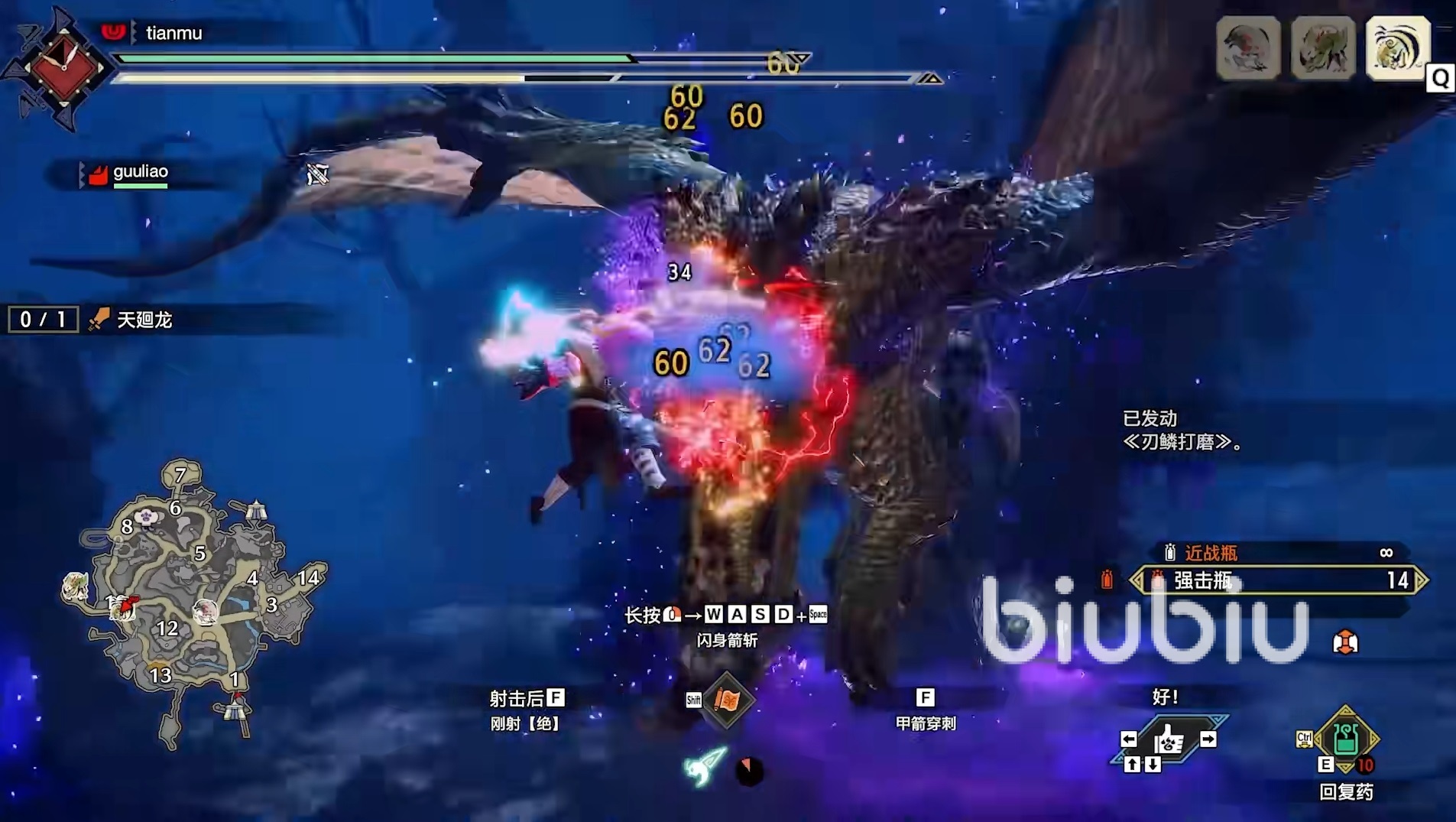 直接箭強(qiáng)化把蓄力提一下,然后就可以開局了。一開始天廻龍是背身可以直接打一個(gè)剛連??ê脮r(shí)間切換,然后再輸出一個(gè)鋼連,之后往后拉距離,防止下一步的動(dòng)作。前期戰(zhàn)斗中就是上面說(shuō)的這些技能,只要做好走位,拉開距離問(wèn)題不大。如果覺得走位失誤躲不開,可以直接利用翻滾。持續(xù)輸出之下天廻龍很快就會(huì)炸膛,接下來(lái)就是愉快的打樁時(shí)光。需要注意的是時(shí)刻要關(guān)注自己的耐力情況,打樁的時(shí)候也要保持安全距離。