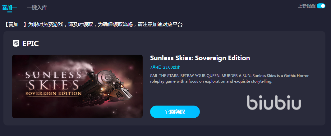 除了限免加速活動以外,biubiu還給大家?guī)砥渌@瑏淼较布右话鍓K就能看到平臺贈送的免費游戲。對游戲感興趣的小伙伴可以根據(jù)系統(tǒng)提示來領取,如果當前贈送的游戲大家不喜歡,也可以勾選上新提醒,等到游戲更換以后就會收到消息推送,說不定下一個游戲就有你們想玩的。