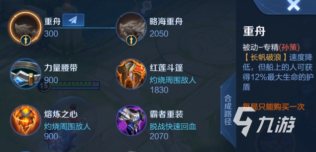 孫策高級專精裝由初級專精裝和力量腰帶融合而成。高級專精略海重舟提供1200的最大生命,并且伴隨力量進階,當孫策額外最大生命達到3000時,三技能的護盾量可提高100%,相當于達到120%的護盾量。在排除真?zhèn)⑿弁猓@一護盾量可保護脆皮在團戰(zhàn)中存活率大大提升。