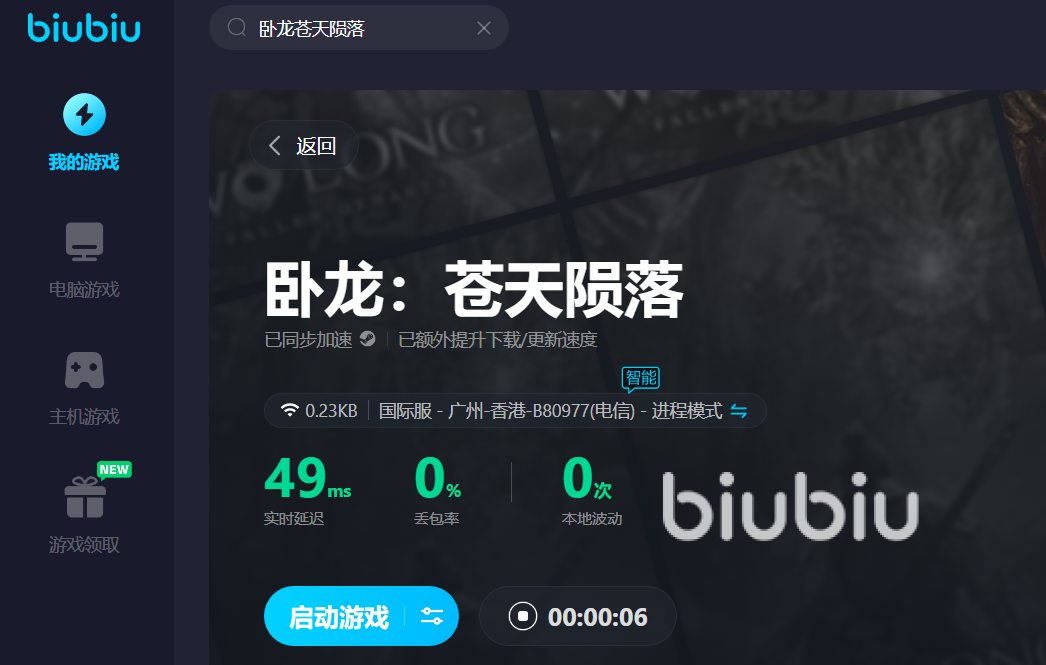 臥龍蒼天隕落是biubiu可以加速的網(wǎng)絡(luò)游戲之一,玩家在使用Biubiu加速臥龍蒼天隕落的時(shí)候,如果自己電腦上有這款游戲的話,在biubiu的:“我的游戲”板塊可以自動(dòng)檢測(cè)出游戲,點(diǎn)擊加速按鈕就可以對(duì)游戲進(jìn)行加速,開啟網(wǎng)絡(luò)加速之后,玩家就可以享受專屬的游戲網(wǎng)絡(luò),讓玩家的游戲體驗(yàn)更好。