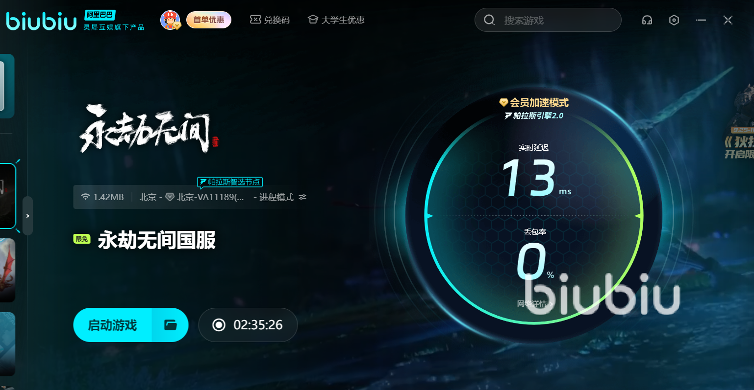 現(xiàn)在,無論你是biubiu的老朋友還是新加入的伙伴,都有大禮相送!新老用戶均可使用【biubiu不掉線】兌換碼,輕松領(lǐng)取3天的免費加速時長。而對于剛剛注冊登錄的新用戶,更有驚喜等著你——直接贈送24小時的免費全平臺會員加速體驗!搭配兌換碼使用,總共可享96小時的免費加速時長,讓你在《永劫無間》的世界里盡情馳騁,無憂無慮!