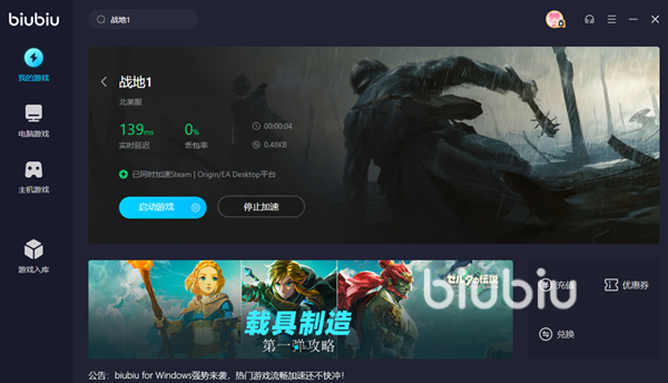 這款工具使用了業(yè)界頂尖的游戲加速技術(shù),能夠幫助大家提升網(wǎng)絡(luò)連接速度,而且支持的游戲也十分全。進(jìn)入軟件之后大家可以在左側(cè)看到區(qū)分了電腦游戲和主機(jī)游戲的庫(kù),針對(duì)不同的玩家?guī)韯e樣的服務(wù)。更加令人驚喜的是,大家會(huì)發(fā)現(xiàn)biubiu加速熱門的主機(jī)游戲都是不收費(fèi)的,其實(shí)有一些國(guó)服游戲也是可以免費(fèi)加速,不得不說真的太良心了。大家在軟件中搜索戰(zhàn)地1的話,就可以看到囊括了目前推出的所有版本,而且也帶有系列的其他熱門作品可以加速。
